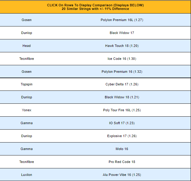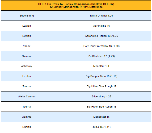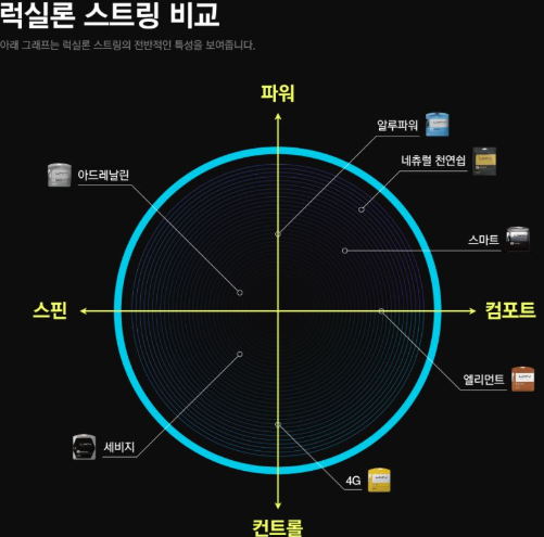 럭실론이 가장 유명한 테니스 스트링이고, 스트링 가격이 거의 2배 정도로 높게 책정되어 있습니다.가장 많이 사용되는 스트링인 알루파워와 유사항 성능의 스트링을 찾아 정리 한다. 성능은 테니스웨어하우스 유니버시티에서 성능 비교를 통해 유사 스트링을 찾는다.