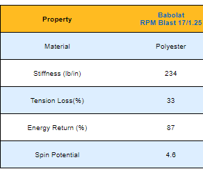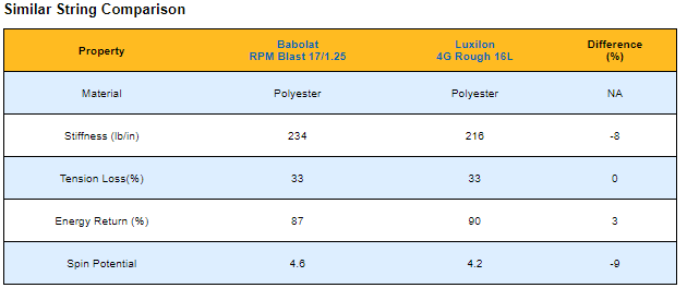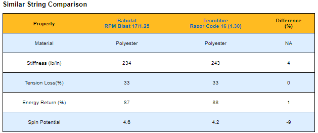 RPM은 극강의 컨트롤을 할 수 있는데, 그 부분은 강성(Stiffness)와 스핀(Spin) 값으로 확인이 가능하다. 대신 강성이 높아서 딱딱한 느낌 혹은 먹먹한 느낌이 사용자에게 나타난다. 시원하게 나가는 느낌은 없지만 그로 인해 컨트롤이 가능하다. 아래 리스트는 tennis warehouse에서 제공하는 유사 제품들이다.
