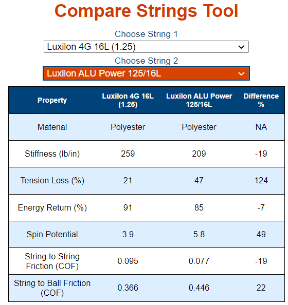 Luxilon ALU Power: Luxilon 4G와 유사한 성능을 제공하는 Luxilon의 또 다른 고급 폴리에스테르 테니스 스트링입니다. 컨트롤과 내구성, 스핀 포텐셜이 뛰어나고 타구감도 비교적 단단한 것으로 알려져 있다. Luxilon 4G와 마찬가지로 다른 줄만큼 많은 힘을 제공하지는 않지만 우수한 장력 유지(tension loss) 기능으로 인해 기능이 더 오랜 시간 동안 유지할 수 있습니다.