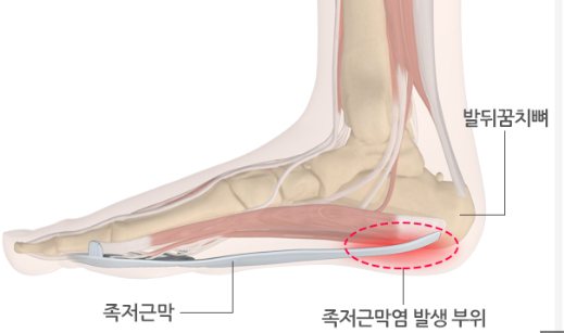 발바닥이 아프다고 해서 모두 족저근막염은 아니다. 대부분의 족저근막염은 뒤꿈치 중앙부 혹은 약간 안쪽의 통증이 있고, 걷기 시작할 때의 통증이 주요한 증상이다. 특히 아침에 일어나 걷기 시작할 때가 가장 심한데 밤에 자면서 족저근막이 수축했다가 아침에 걷게 되면 다시 갈라지고 벌어지면서 더욱 큰 통증이 나타난다. 그래서 발바닥 아치 중앙부가 주로 아프거나 걷고 나서 통증이 심해진다든지, 걷지 않고 가만히 휴식을 취하고 있을 때도 발바닥이 아프다면 다른 원인은 아닌지 꼭 확인이 필요하다.
