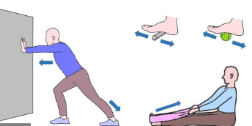 오른발 왼발을 11자로 만들고 어깨 넓이 정도로 벌리고, 벽을 민다. 뒤에 빠진 발의 종아리와 발바닥의 근육이 늘어지는 것을 느끼며, 10 ~20초 정도 유지 시켜준다. 발이 꼭 11자 형태로 해야 한다. 바깥을 보거나 안쪽으로 되면 근육이 충분히 스트레칭 되지 않는다.