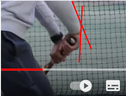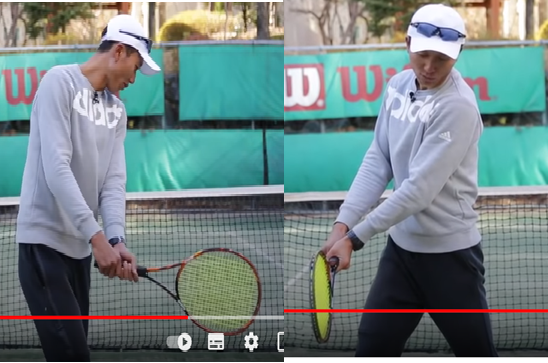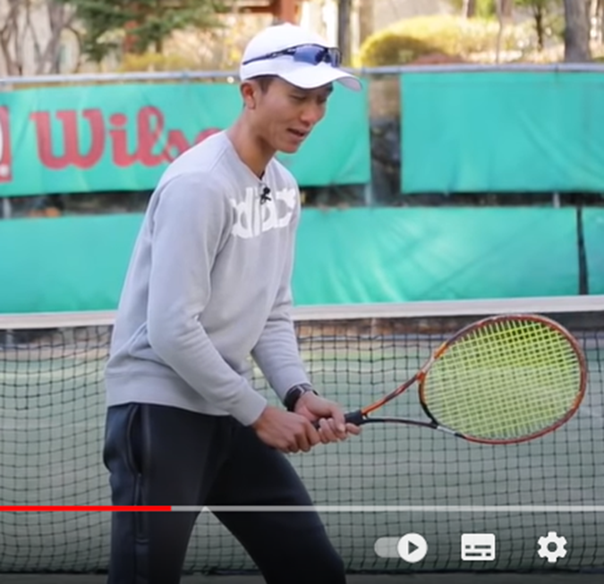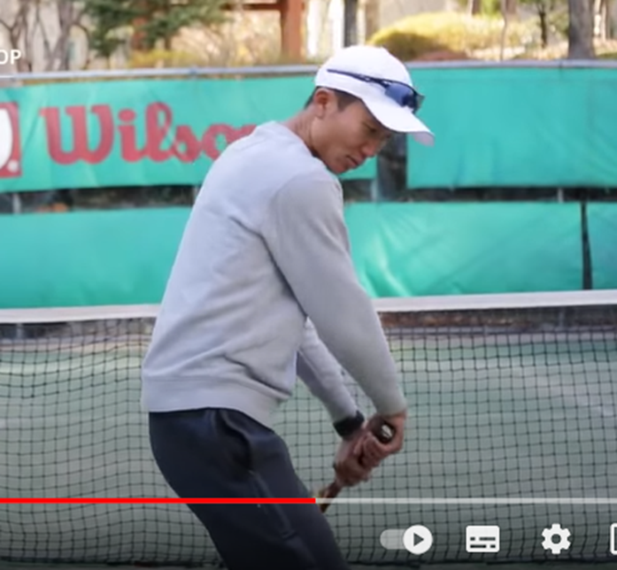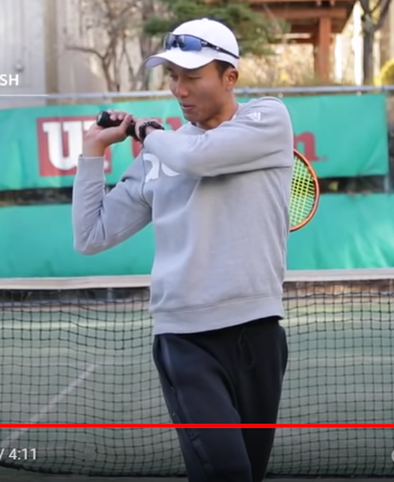 라켓 해드를 떨어트릴 때 코치님을 오른쪽 손목을 보시면 팔과 직선이 아니라 구부린 것을 볼 수 있습니다. 코치님은 자연스럽게 되는 거지만, 저희 같은 아마추어는 손목 구부림 없이 헤드를 떨어트릴 겁니다. 오른손을 그립을 살짝 말아 쥔다는 느낌으로 살짝만 틀어 주시면 라켓 헤드가 자연스럽게 떨어집니다.