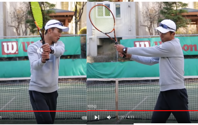 라켓 해드를 떨어트릴 때 코치님을 오른쪽 손목을 보시면 팔과 직선이 아니라 구부린 것을 볼 수 있습니다. 코치님은 자연스럽게 되는 거지만, 저희 같은 아마추어는 손목 구부림 없이 헤드를 떨어트릴 겁니다. 오른손을 그립을 살짝 말아 쥔다는 느낌으로 살짝만 틀어 주시면 라켓 헤드가 자연스럽게 떨어집니다.