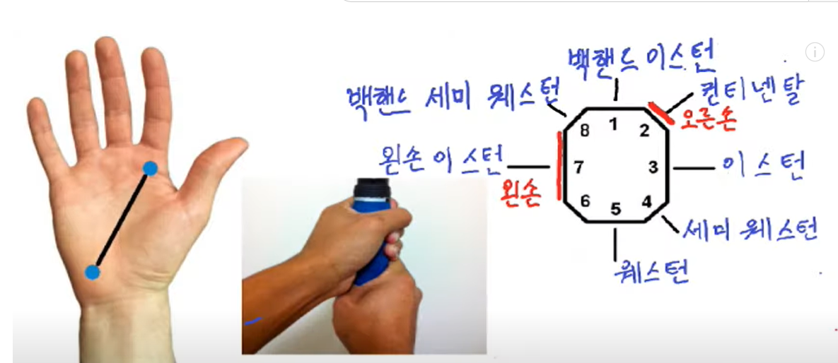 즉 오른손은 컨티넨탈 그립, 왼손은 이스턴 그립으로 잡으면 됩니다. 왼손으로 이스턴 그립을 잡으면 컨텐 포지션에서 라켓이 수직으로 되고, 공과 플랫하게 컨를 할 수 있는 그립이기 때문입니다.