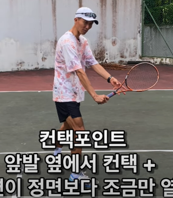 앞발 옆에서 컨택하며, 라켓면은 정면 즉 수직으로 만들지 말고 하늘쪽으로 약간 열기게 만들어야 언드스핀을 만들 수 있습니다.