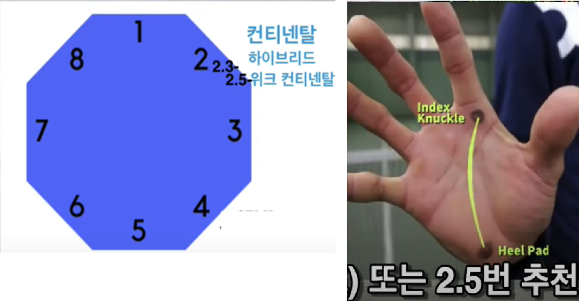 컨티넨탈 그립을 기본으로 하며, 하이브리드나, 위크 컨티넨탈을 사용할 수 있습니다. 박주승 코치니면 하이브리드를 추천합니다. 저는 컨티넨탈을 사용합니다. 짧은 볼인 경우 발리를 하는 위치에서 바로 처리를 해야 하므로, 발리 그립인 컨티넨탈에서 바로 처리 할 수 있도록 하는 편이 그립 체인지 없이 처리가 가능 합니다.